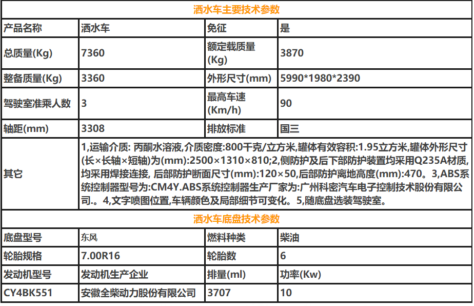 國(guó)六東風(fēng)小多利卡 5噸 灑水車(chē) 核心參數(shù)項(xiàng)目參數(shù)軸距(mm)3308…