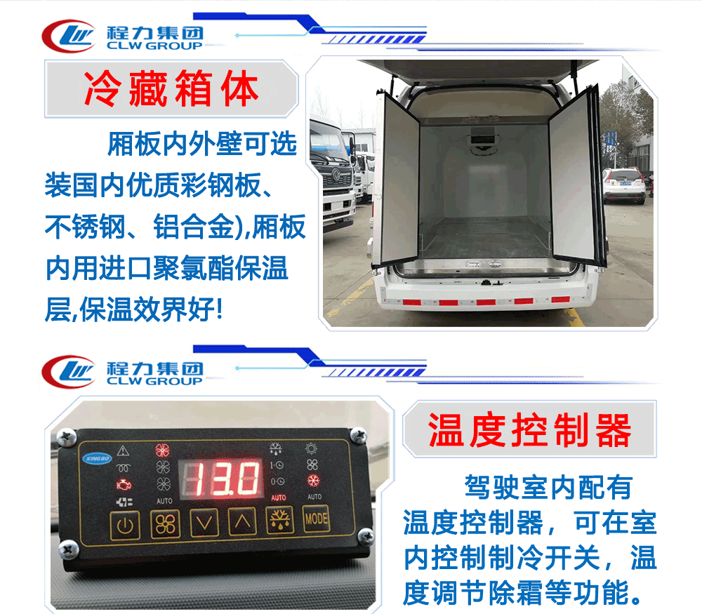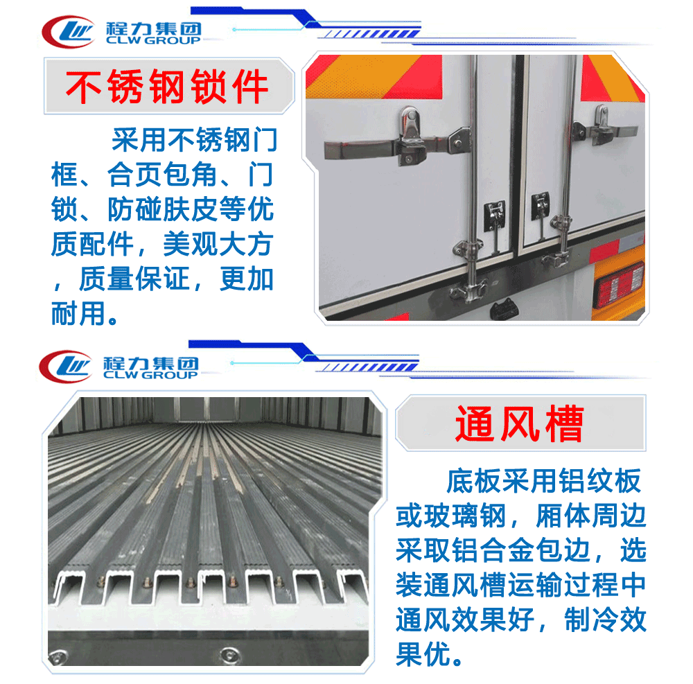 箱體一般標配內(nèi)外采用2.2mm優(yōu)質(zhì)玻璃鋼材質(zhì),中間8cm聚氨酯發(fā)泡保溫層,廂體底板材質(zhì)采用花紋防滑鋁底板,配不銹鋼門鎖件。