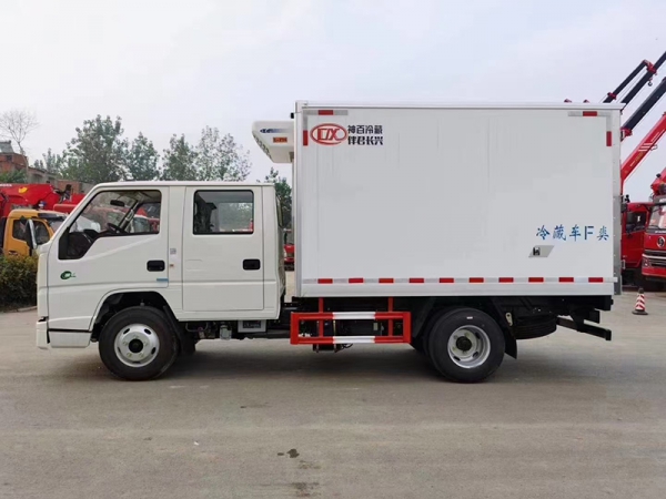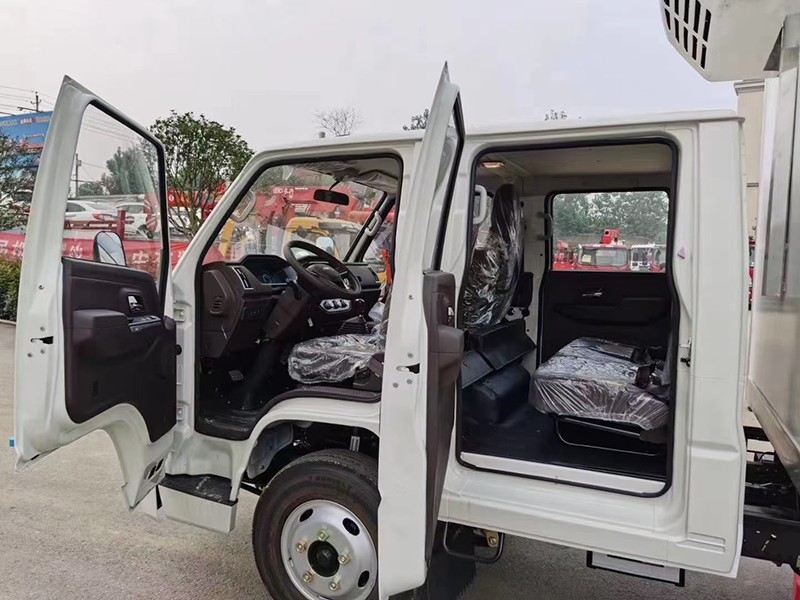 江鈴順達雙排冷藏車,整車型號:AAA5043XLCJX6,整車尺寸:5995×1980×2900,廂體尺寸:3250×1800×1800,五十鈴115馬力發動機,5檔變速箱,原廠空調,助力,ABS,油剎,軸距3360,7.00R16LT 8PR輪胎,廂體采用內外玻璃鋼、中間8CM 厚聚氨酯保溫板、底板為防滑花紋鋁板,單開側門,不銹鋼門鎖件,-15度制冷機組,其余標配。